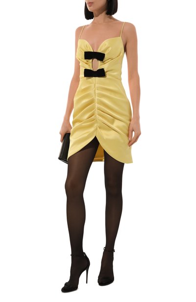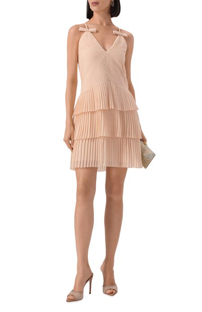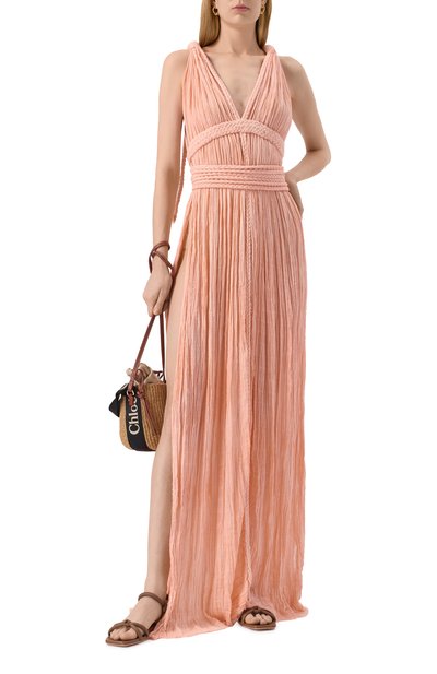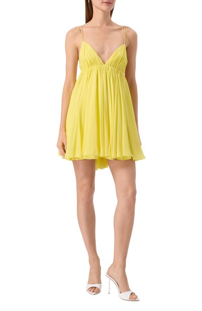 Драпированное платье L’Etoile Du Sud с открытой спиной и завышенной линией талии выполнили из шелка. Модель с расклешенным подолом и двумя парами тонких завязок с жемчужными бусинами на концах декорировали золотистым цветком на V-образном вырезе.