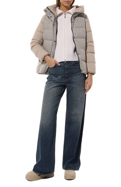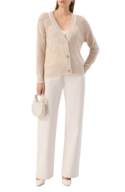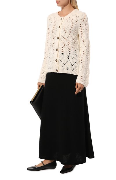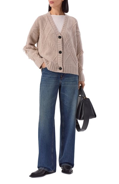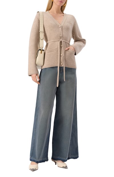 Удлиненный кардиган, связанный объемной французской резинкой из мериносовой шерсти, вошел капсулу GI. Модель со спущенной линией плеч и парой карманов по бокам застегивается кожаным ремешком, регулируемым кобурной кнопкой.