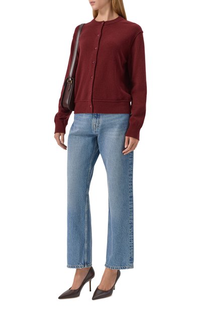 Свободный пуловер Aura со спущенной линией плеч выполнили из монгольского кашемира. Связанную гладью модель дополнили горловиной, широкими поясом и манжетами в рубчик.