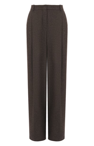 Широкие прямые брюки с защипами и стрелками выполнили из ворсистой шерсти с добавлением кашемира. Меланжевую модель дополнили парой узких листочек сзади и двумя карманами по бокам.
