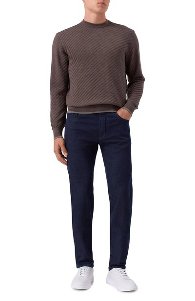 Джемпер связали в две нити арановым узором, а круглую горловину, манжет и пояс – резинкой. Для создания модели использовали пряжу из чистого монгольского кашемира.