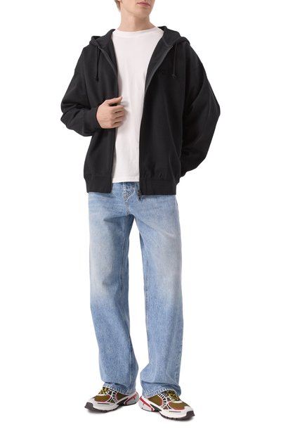 Толстовку с регулируемым капюшоном и боковыми карманами выполнили из начесанного трикотажа на основе хлопка, шерсти и вискозы. Модель застегивается встречной молнией с кожаной лентой на верхнем пуллере.