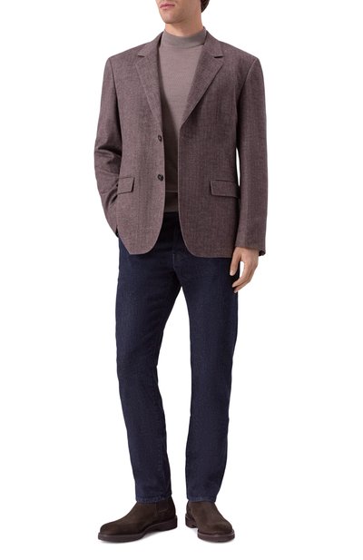 Однобортный пиджак выполнили из французского хлопкового вельвета, предусмотрев комбинированный подклад. Модель с внутренним и двумя внешними карманами по бокам дополнили листочкой на груди.