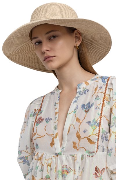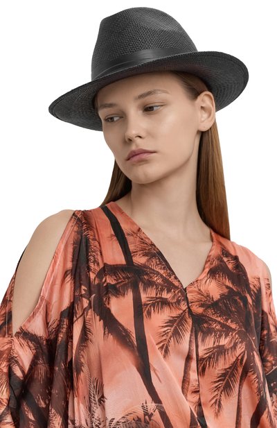 Шляпу-федору с характерной вмятиной на тулье выполнили из плотного фетра. Сбоку лаконичный аксессуар декорировали металлической эмблемой марки.