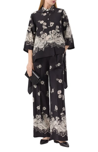 Свободные брюки с эластичным поясом выполнили из шелка с принтом в виде кристальных подвесок. По бокам предусмотрели карманы. Наши стилисты предлагают создать total look с парной рубашкой.