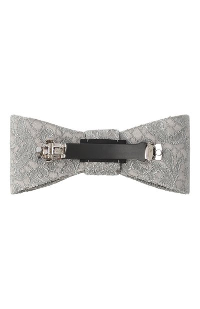 Для создания банта-бабочки использовали жаккард на основе шелка и полиэстера. Аксессуар дополнили металлической заколкой-автоматом с защитной накладкой.