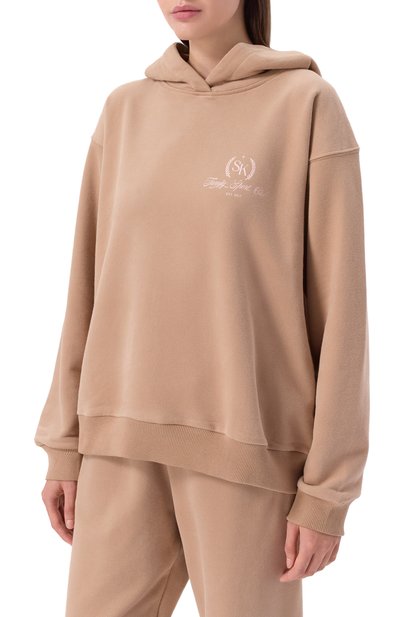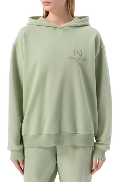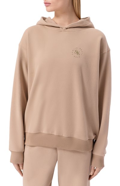 Костюм SK Serena выполнили из хлопка с добавлением полиэстера. Спереди и на левом рукаве разместили символику бренда, которой вторит логотип на джоггерах с двумя карманами.