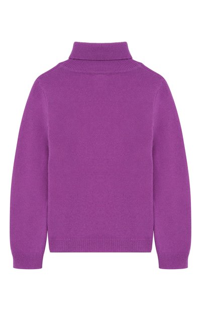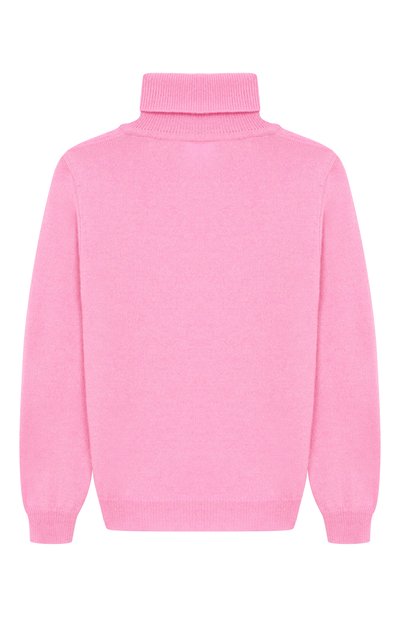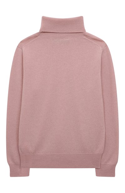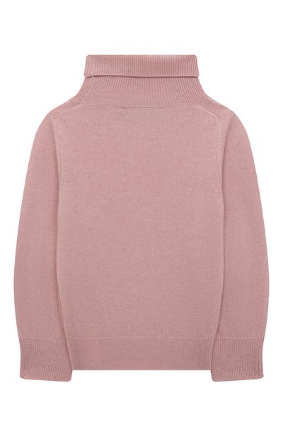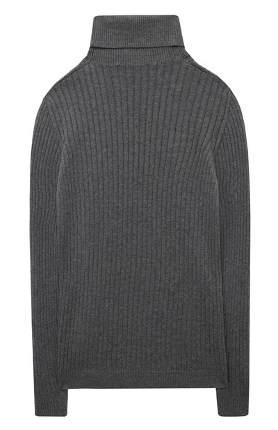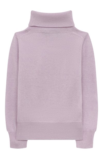 Однотонную водолазку выполнили из кашемирового трикотажа. Эластичные манжеты и пояс, а также высокую горловину с отворотом связали в рубчик.