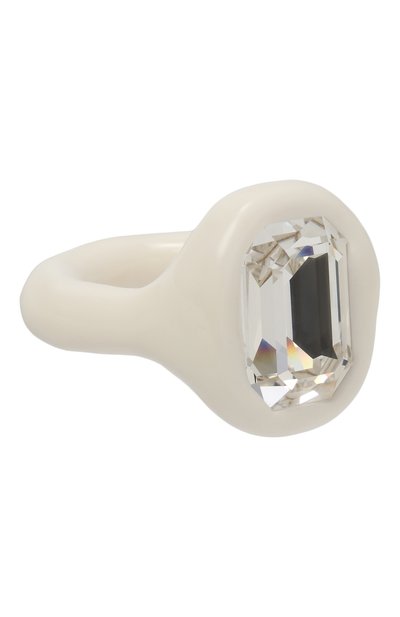 Кольцо с лаковым покрытием изготовили вручную из полимерной глины. Украшение с тисненой эмблемой марки дополнили граненым кристаллом Swarovski.