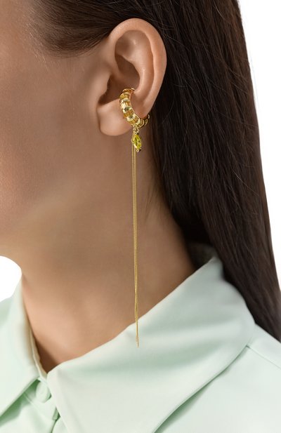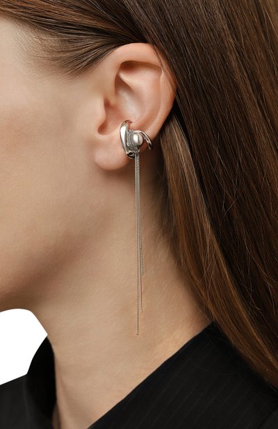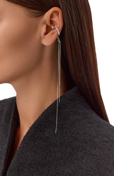 Кафф «Листья» выполнили из латуни с покрытием белым родием. Аксессуар дополнили длинными подвесками-цепочками, ниспадающими почти до плеча.