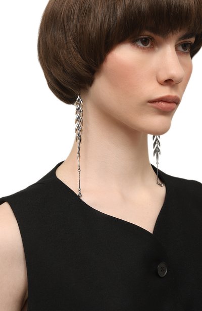 В коллекцию «Больше, чем любовь» вошли серьги с основанием в форме листьев. Пусеты с длинными подвесками-цепочками выполнили из латуни с гальваническим покрытием белым родием.