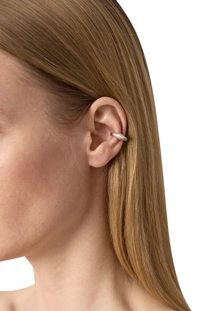 Кафф «Больше чем любовь» в форме изогнутой ветви с листьями выполнили из латуни с гальваническим покрытием белым родием. Аксессуар дополнили четырьмя подвесками-цепочками разной длины.