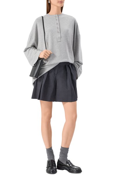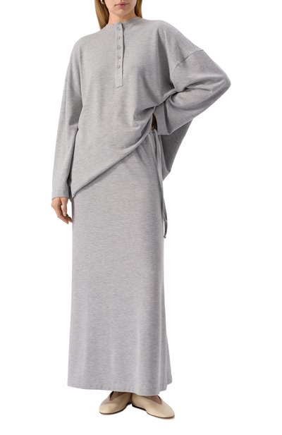 Лонгслив с рукавами 3/4 выполнили из тонкого меланжевого трикотажа на основе тенсела с добавлением шерсти. Облегающая модель легко впишется в повседневные образы разной сложности.