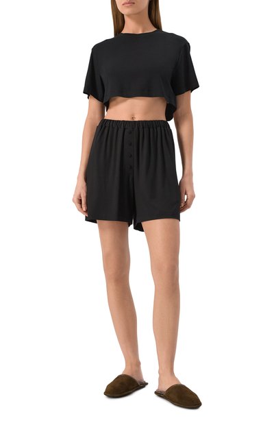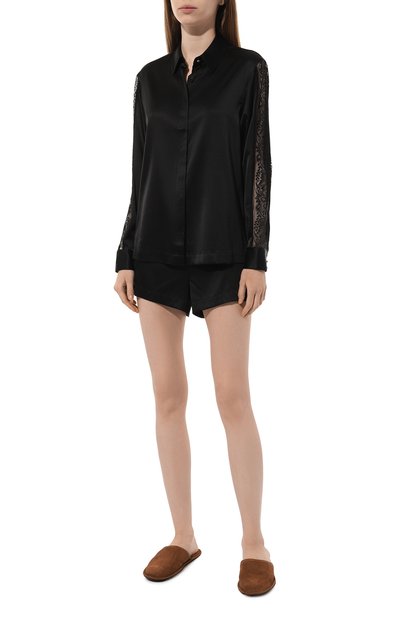 Шорты Love Me с эластич ной вставкой на поясе сзади выполнили из атласа на основе шелка. Модель с боковыми разрезами украсили кружевной отделкой.