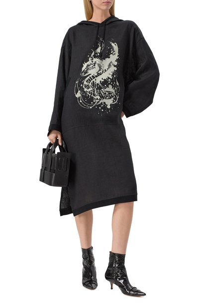 Приталенное мини-платье с немного расклешенным подолом выполнили из атласа на основе вискозы и полиэстера. Модель с круглым вырезом и длинными рукавами предлагаем носить с босоножками на шпильке.