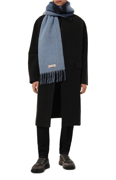 Для изготовления широкого шарфа с крупным логотипом бренда использовали ворсистую шерсть. Края модели подчеркнули бахромой.