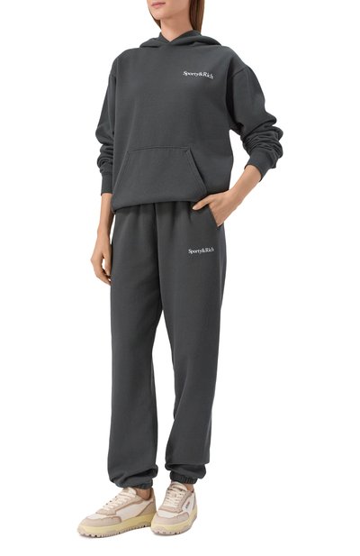 Джоггеры Kimmie с высокой посадкой и широким поясом сшили из эластичной фланели. Брюки с лампасами из нейлонового рипстопа дополнили задними накладными карманами и боковыми врезными на молниях.
