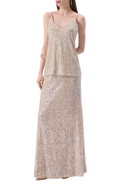 Миди-юбку А-силуэта выполнили из пряжи на основе кашемира и хлопка с добавлением металлизированных нитей. Модель с широким поясом в рубчик декорировали миниатюрными пайетками.