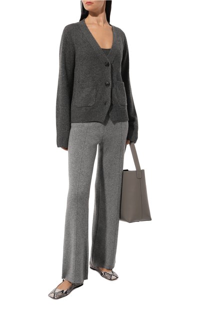 Брюки с двумя боковыми карманами выполнили из микса шерсти и кашемира. Комфортную посадку модели обеспечивает широкий пояс-кулиска.