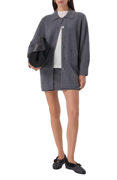 Кардиган с отделкой в рубчик связали из пряжи на основе кашемира и хлопка с добавлением металлизированных нитей. Модель с парой накладных карманов и глубоким V-образным вырезом декорировали миниатюрными пайетками по всей поверхности.