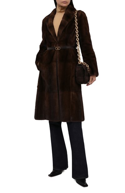 Для пошива шубы с высокой шлицей, широкими манжетами и супатной застежкой использовали мех норки. Модель свободного кроя дополнили парой накладных карманов.