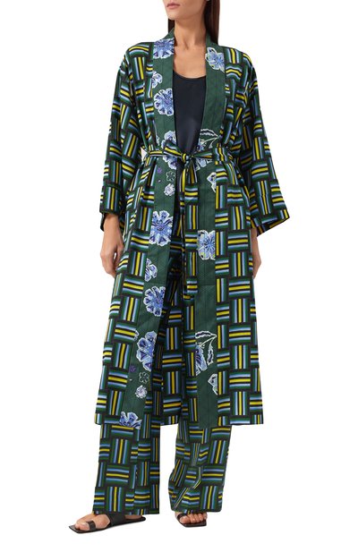 Костюм Lupin с брендированным цветочным принтом выполнили из шелковой ткани. Рубашку со спущенной линией плеч дополнили планкой с пуговицами. Посадку свободных брюк с боковыми карманами можно отрегулировать шнуром, продетым в кулиску на поясе.