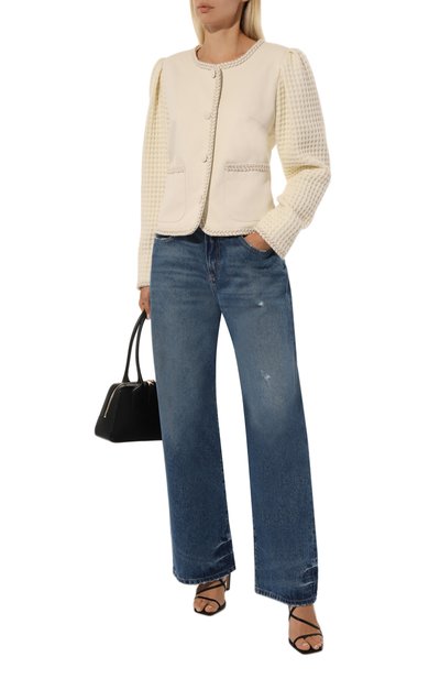 Жакет с круглой горловиной и накладными карманами выполнили из полушерстяного твида. Модель на атласном подкладе застегивается золотистыми пуговицами.