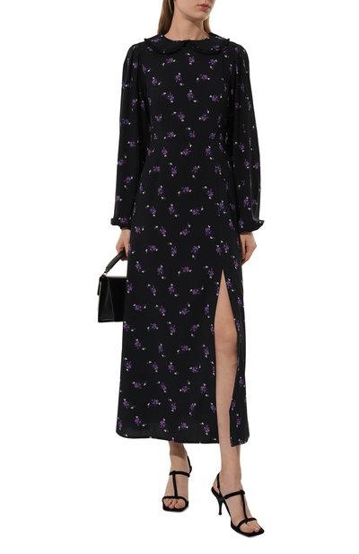 Платье с асимметричным низом, сшитое из тонкой вискозы, станет основой образа total black. Свободную модель с узким вырезом и воротником «аскот» дополнили боковыми карманами.