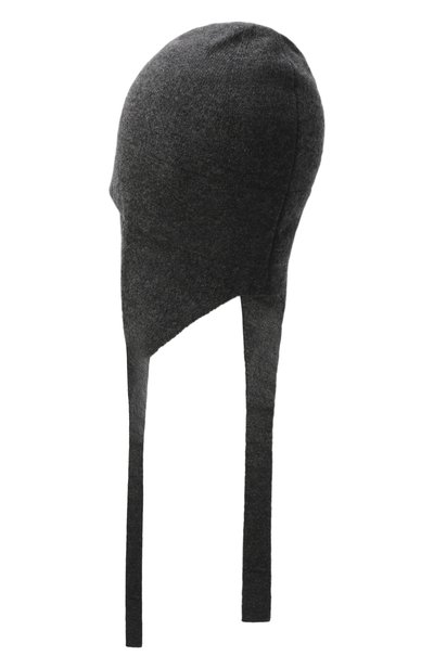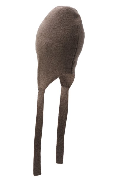 Двухслойную шапку-ушанку связали из смеси шерсти австралийского мериноса и тосканского кашемира. Эластичный аксессуар дополнили длинными лентами-завязками в тон.