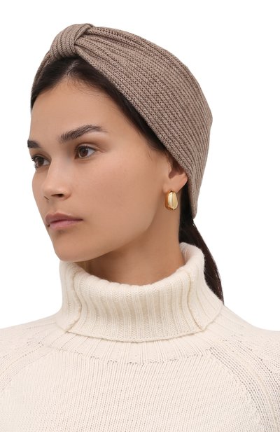 Повязку Sveta выполнили по технологии 3D tube из вискозной пряжи с добавлением мохера SuperKid и полиамида. Спереди связанный резинкой аксессуар задрапировали.