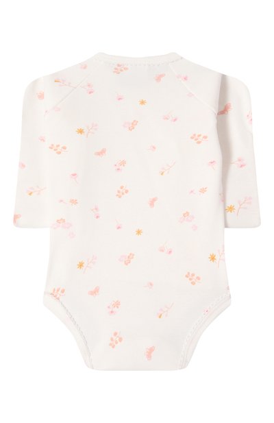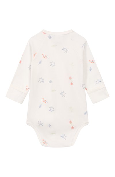 Боди с кнопками слева и снизу украсили принтом, имитирующим детский рисунок. Для пошива модели выбрали джерси из органического хлопка, сертифицированного по стандартам Gots и Oeko-Tex®.