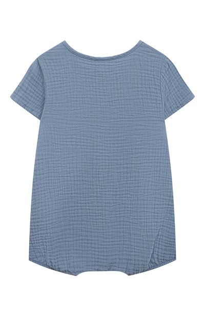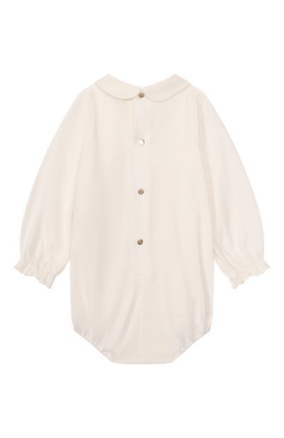 Боди с волнистой баской сшили из органического хлопкового джерси. Круглую горловину украсили атласным бантом, а саму модель ─ небольшим принтом.
