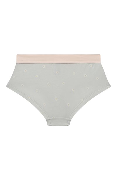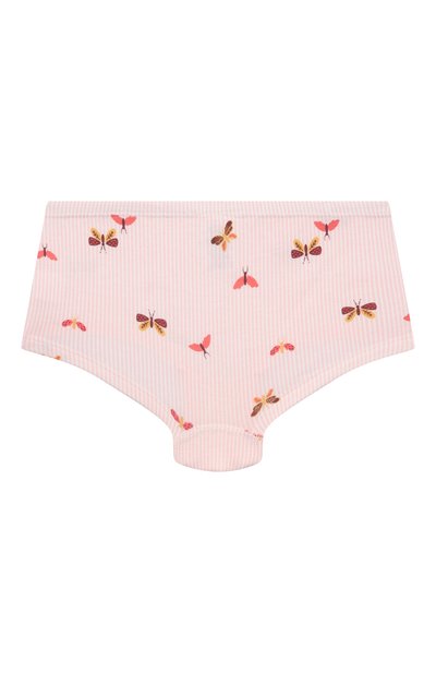 Трусы с цветочным принтом выполнили из трикотажа на основе органического хлопка, сертифицированного Oeko-Tex® Standard 100. Модель с отделкой в рубчик украсили миниатюрным бантом на эластичном поясе.