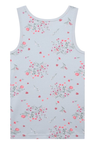 Майку с принтованным паттерном выполнили из органического хлопка, сертифицированного GOTS. Горловину с атласным бантом и проймы дополнили ажурной каймой.