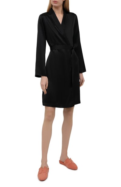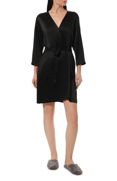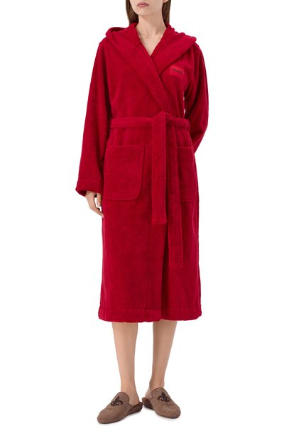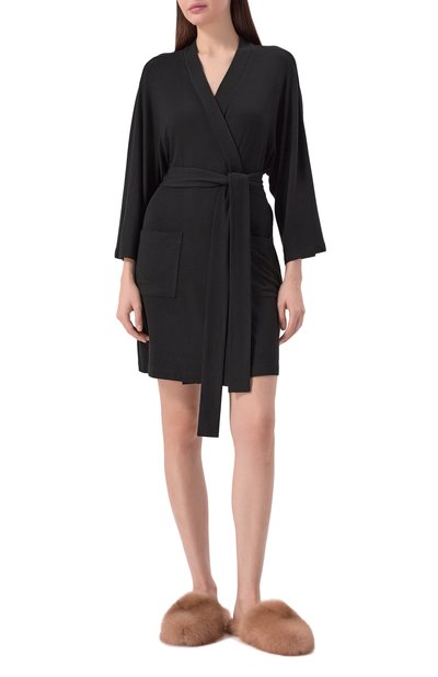 Короткий халат с рукавами 3/4 выполнили из эластичного вискозного трикотажа с добавлением полиэстера и шерсти. Модель с двумя накладными карманами и поясом-лентой, регулирующим запах, декорировали вышитой эмблемой на спинке.