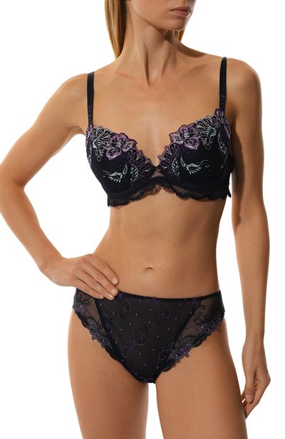 Слипы со средней посадкой сшили из комбинации гладкого полиамидного джерси и ажурного кружева с цветочным мотивом. Модель дополнили хлопковой ластовицей.