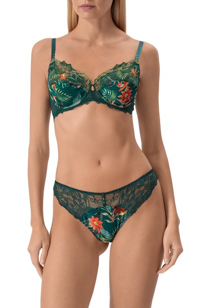 Бюстгальтер с плотными чашечками пуш-ап выполнили из шелкового атласа с тропическим принтом и тюля с французской вышивкой. Узкие бретели модели из коллекции Tropique en Fleurs украсили стразами, а перемычку – фирменной подвеской.
