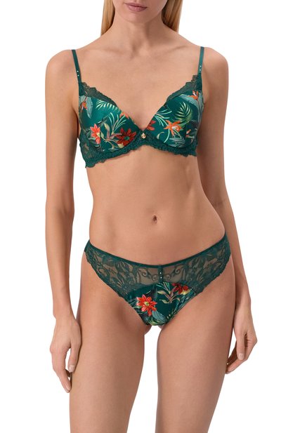 Трусы-бразилиана Tropique en Fleurs изготовили из кружева и текстиля с тропическим узором. Сзади модель дополнили тюлевой вставкой, обрамленной вышивкой, а спереди белье украсили стразами.
