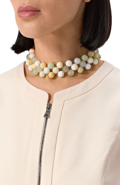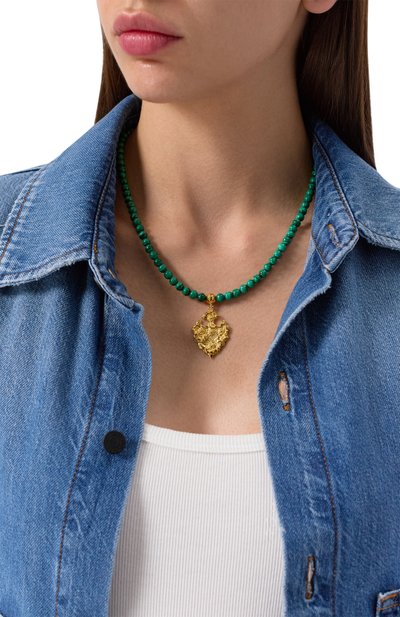 Колье Emerald Embrace собрали вручную из граненых бусин разных размеров. Украшение с розами из золотистого ювелирного сплава дополнили удлиняющей цепочкой и миниатюрным карабином с кристаллами.