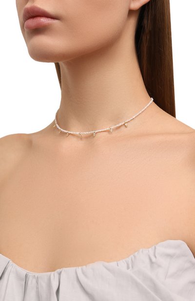 Незамкнутое колье Silent Garden выполнили из жемчуга Майорка и металлических звеньев с родиевым покрытием. Концы украшения подчеркнули подвесками в форме цветов, покрытых фианитами.
