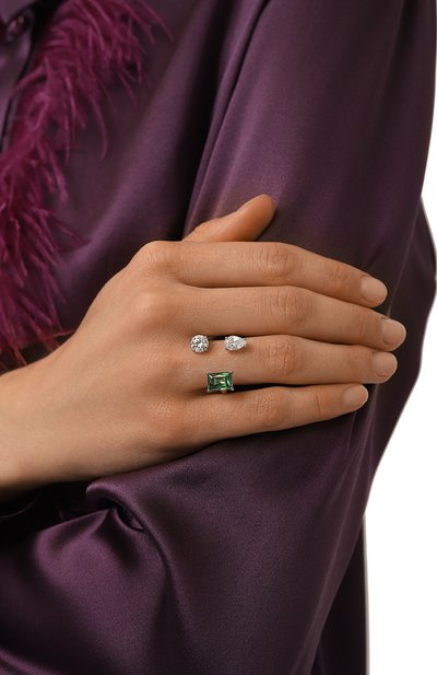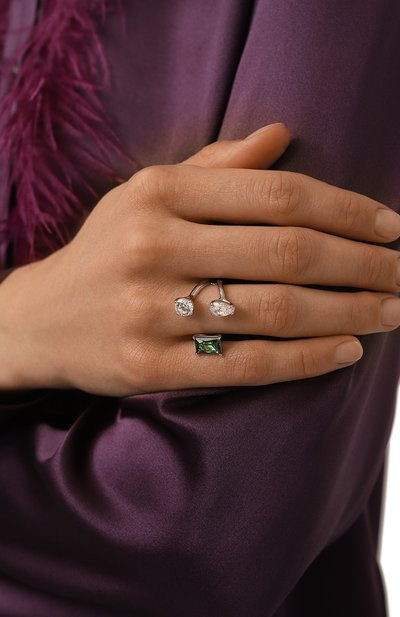Широкое кольцо Dusk Orchid собрали из трех нитей разноразмерных жемчужин майорка. Аксессуар декорировали крупным голубым кристаллом в оправе из покрытого р одием ювелирного сплава, инкрустированной прозрачными фианитами.