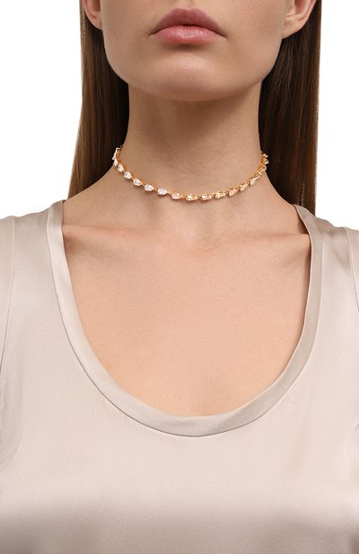 Для изготовления двухниточного чокера с застежкой-сферой использовали жемчуг м айорка и ювелирный сплав с родиевым покрытием. Аксессуар декорировали вставками с крупными овальными кристаллами, окруженными прозрачными фианитами.