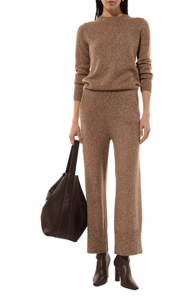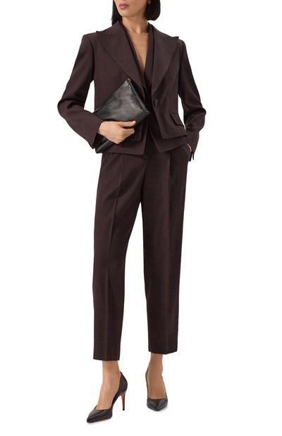 Костюм выполнили из атласа на основе вискозы и полиэстера. Рубашку дополнили петлей и бантовой складкой на удлиненной спинке, а у брюк предусмотрели боковые карманы и эластичный пояс-кулиску.