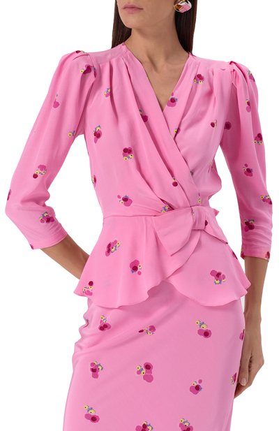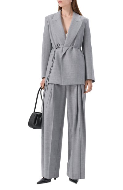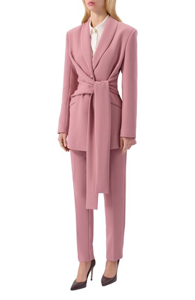 Для создания костюма с жаккардовым узором использовали трикотаж из микса вискозы, полиэстера и полиамида. Кардиган с перламутровыми пуговицами дополнили двумя накладными карманами, а брюки с эластичным поясом – парой боковых.