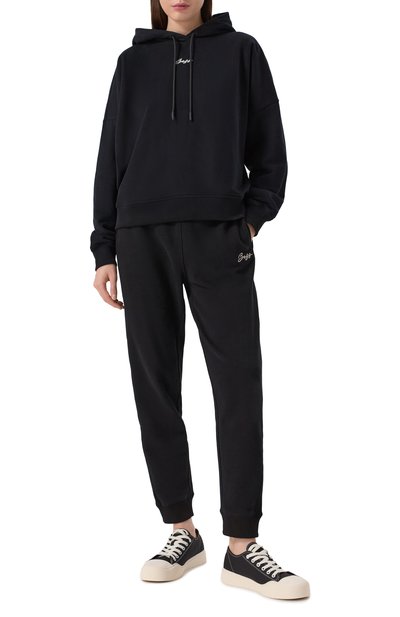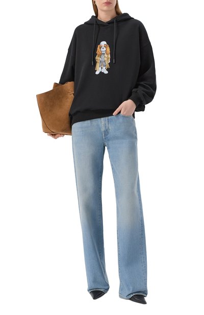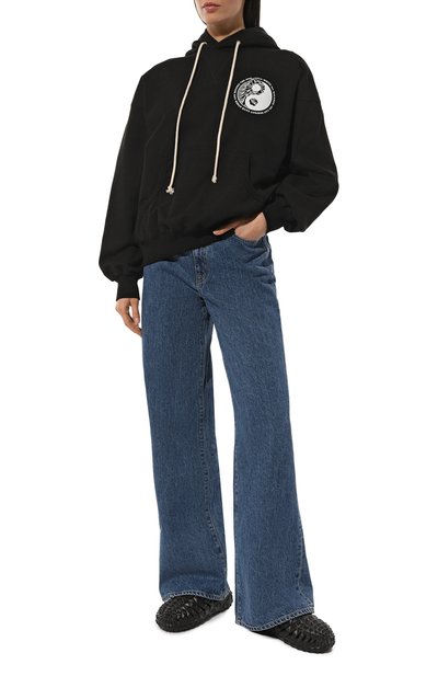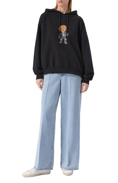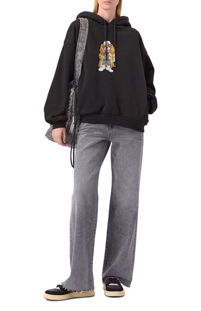 Свободное худи с приспущенной линией плеч и регулируемым капюшоном выполнили из хлопка с добавлением полиэстера. Спереди модель украсили двумя крестами со стразами.