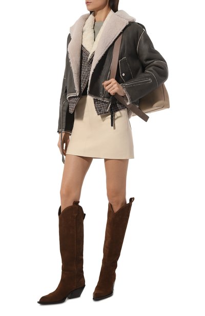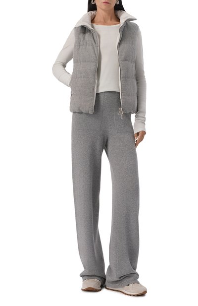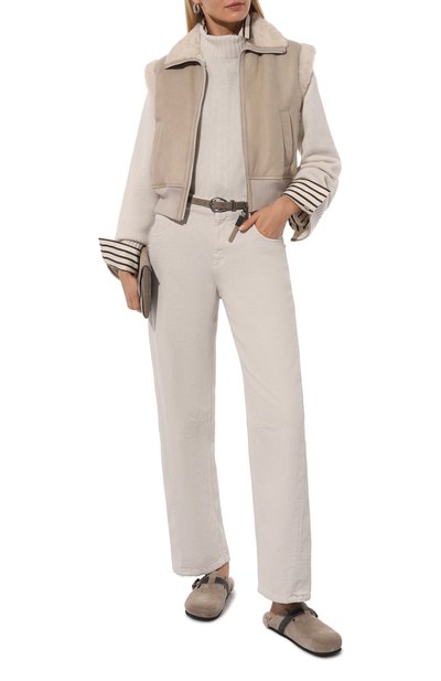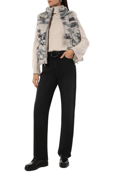Жилет с рельефным шевронным узором сшили из тонко выделанного меха норки. Модель с высокой горловиной и широким поясом из трикотажа в рубчик застегивается встречной молнией.