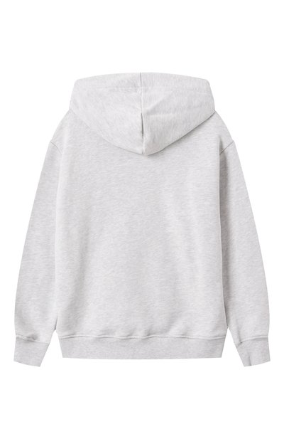 Худи с рифлеными манжетами и поясом выполнили из хлопкового футера с флисовой изнанкой. Выбеленную модель со слегка спущенной линией плеч украсили глянцевыми полосой и логотипом в тон.