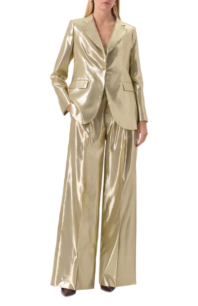 Жакет, утепленный верблюжьей шерстью, выполнили из жатого металлизированного нейлона. Модель с двумя шлицами сзади дополнили парой накладных карманов.
