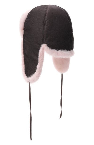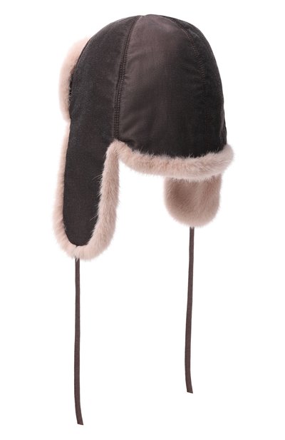 Шапку-ушанку с загнутым наверх козырьком выполнили из влагостойкой технической ткани и неокрашенного лисьего меха с длинным ворсом. Широкие наушники аксессуара дополнили кожаными завязками.