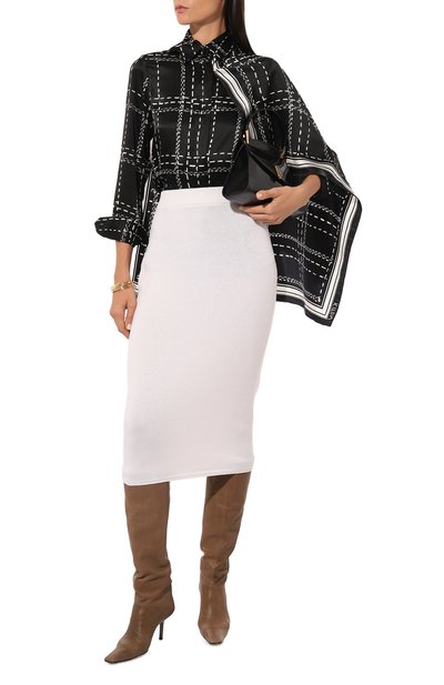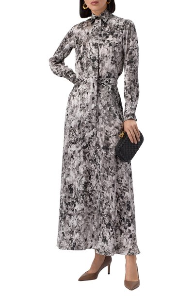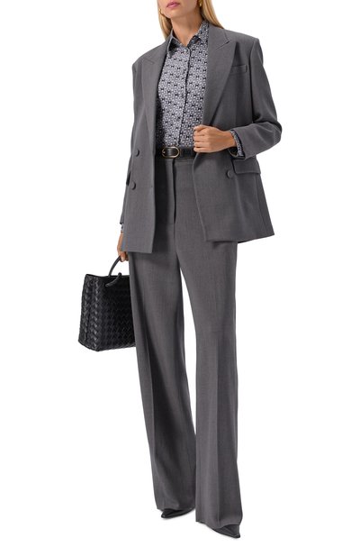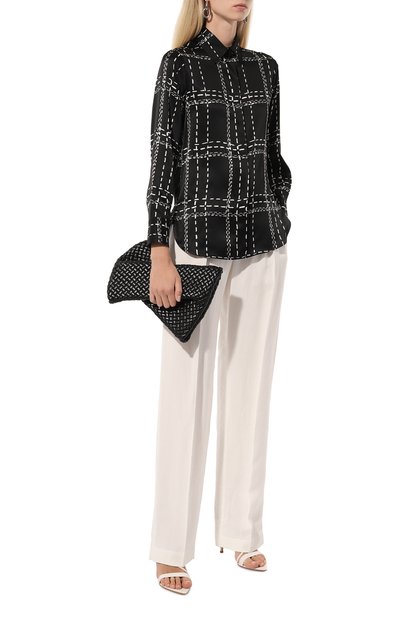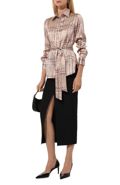 Свободную блузку с рядом пуговиц-жемчужин выполнили из принтованного шелка, задрапировав его спереди, на спинке и объемных рукавах. Из такого же материала создали узкий пояс, для которого предусмотрели шлевку на V-образной горловине сзади.